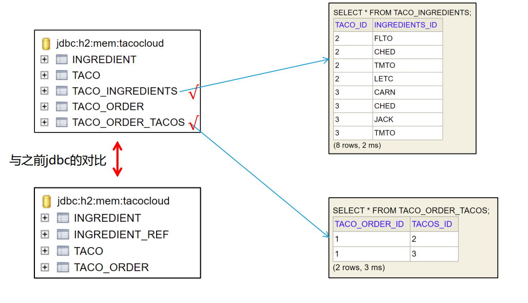 - 在实体类中指定对应关系,打上**@Entity**,见Ingredient, scheme.sql不用手写,根据java对象的定义自动生成表结构